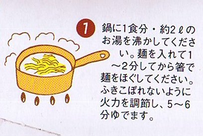 麺を入れて1~2分してから箸で麺をほぐれて下さい。[men wo irete ichi~ni bun shite kara hashi de men wo bogurete kudasai.]Une à deux minutes après avoir mis les pattes, séparer les avec des baguettes.