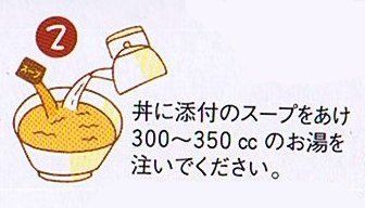 丼に添付のソープをあけ300~350ccのお湯を注いでください。[donburi ni tenpu no so-pu wo ake san hyaku~san hayku go juu no oyu wo chuui de kudasai.]Avec prudence ajouter 300 à 350 cc d'eau chaude et ouvrer la sauce jointe dans le bol.